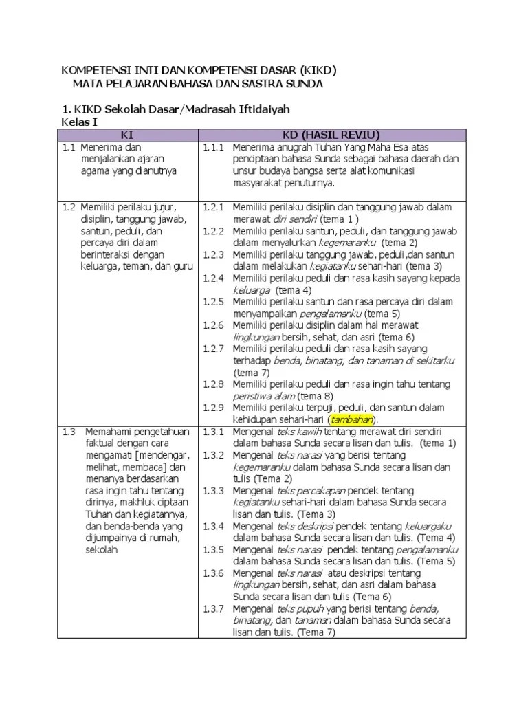 Ki dan kd bahasa sunda sd kurikulum 2013 kelas 1,2,3,4,5,6. Kali ini kami bagikan ki dan kd (kompetensi inti dan kompetensi dasar) mata pelajaran bahasa sunda kurikulum 2013 yang sudah di revisi tahun . Bospedia ingin membagikan kepada kepada bapak dan ibu guru tentang rpp & silabus mulok bahasa sunda sd kelas 1, 2, 3, 4, 5, 6. Penomoran ki dan kd tidak lagi ditandai dengan jenjang pendidikan (kelas), tetapi sesuai dengan nomor urutan ki. Bahasa, dan lambang negara serta lagu kebangsaan;