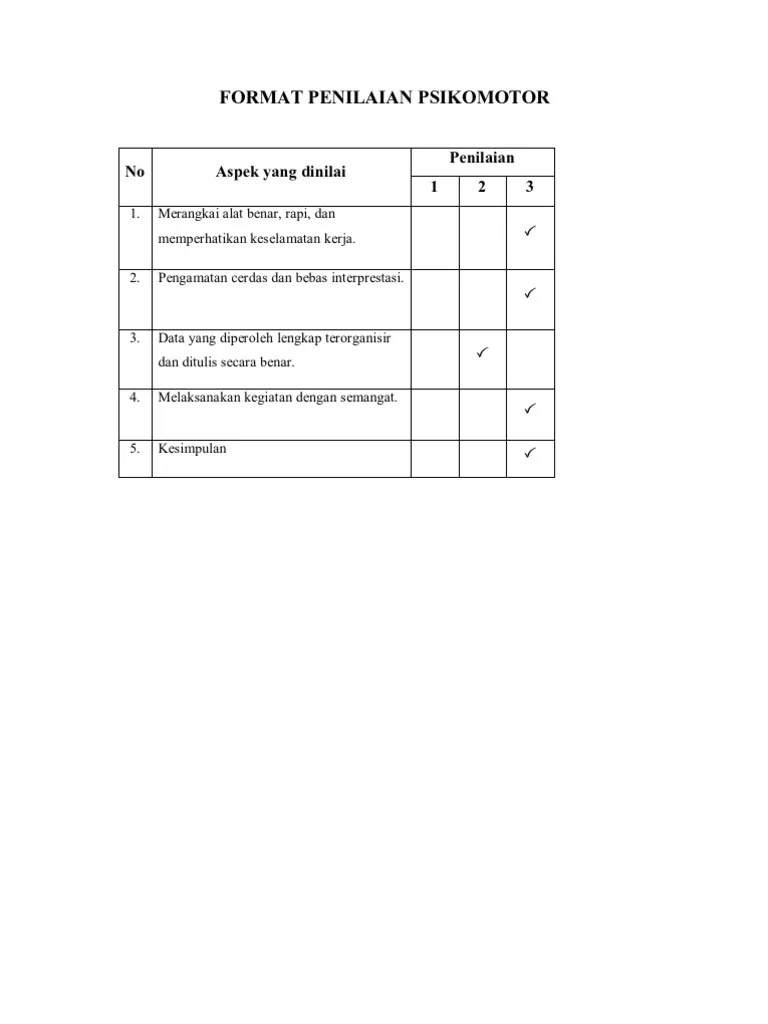 Bagaimana penilaian proses belajar melalui bimbingan aspek afektif, kognitif dan psikomotorik siswa di mis amal shaleh medan? Perancangan atau design dipilih format instrumen penilaian kinerja. Penilaian aspek psikomotor oleh guru di sekolah di wilayah jakarta timur pada . Adapun aspek psikomotorik yang diamati mengacu pada model pembelajaran inkuiri terbimbing yaitu mengajukan pertanyaan atau masalah, membuat hipotesis, merancang . Contoh instrumen yang dapat mengukur hal tersebut adalah lembar penlaian.